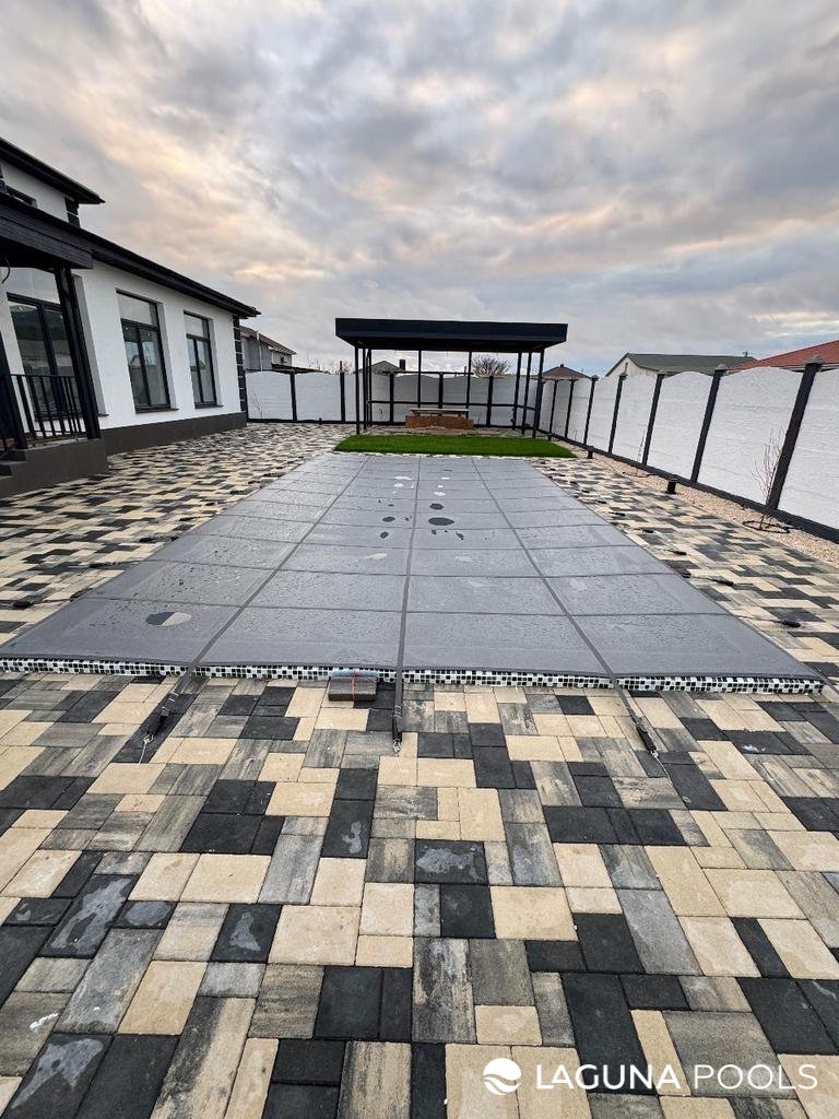 Композитный бассейн закрыт серым защитным покрытием, окружён тротуарной плиткой и зоной отдыха с беседкой.